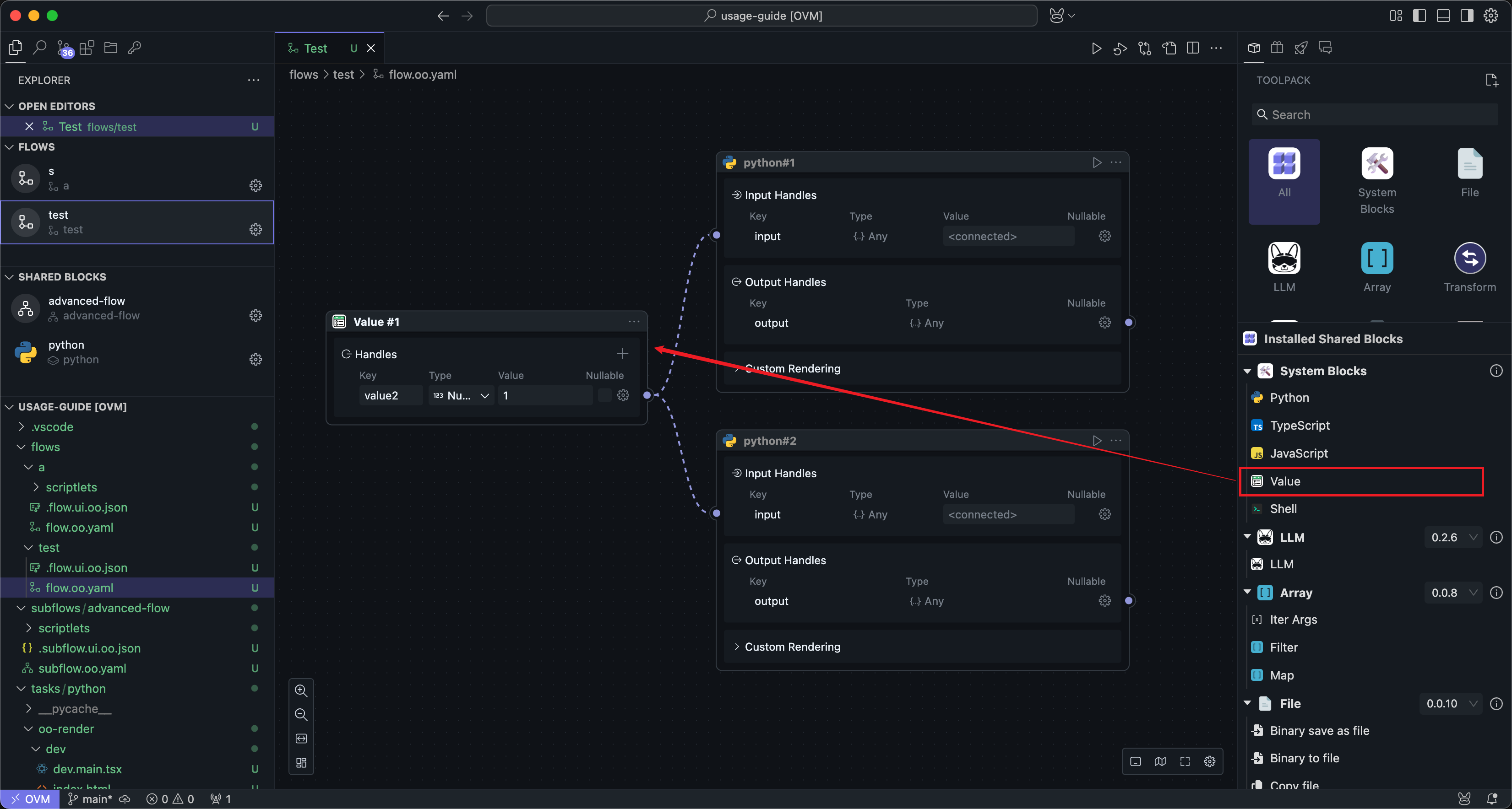 The Value Block is a special built-in Shared Block in OOMOL Studio, designed to provide users with a reusable constant input box.